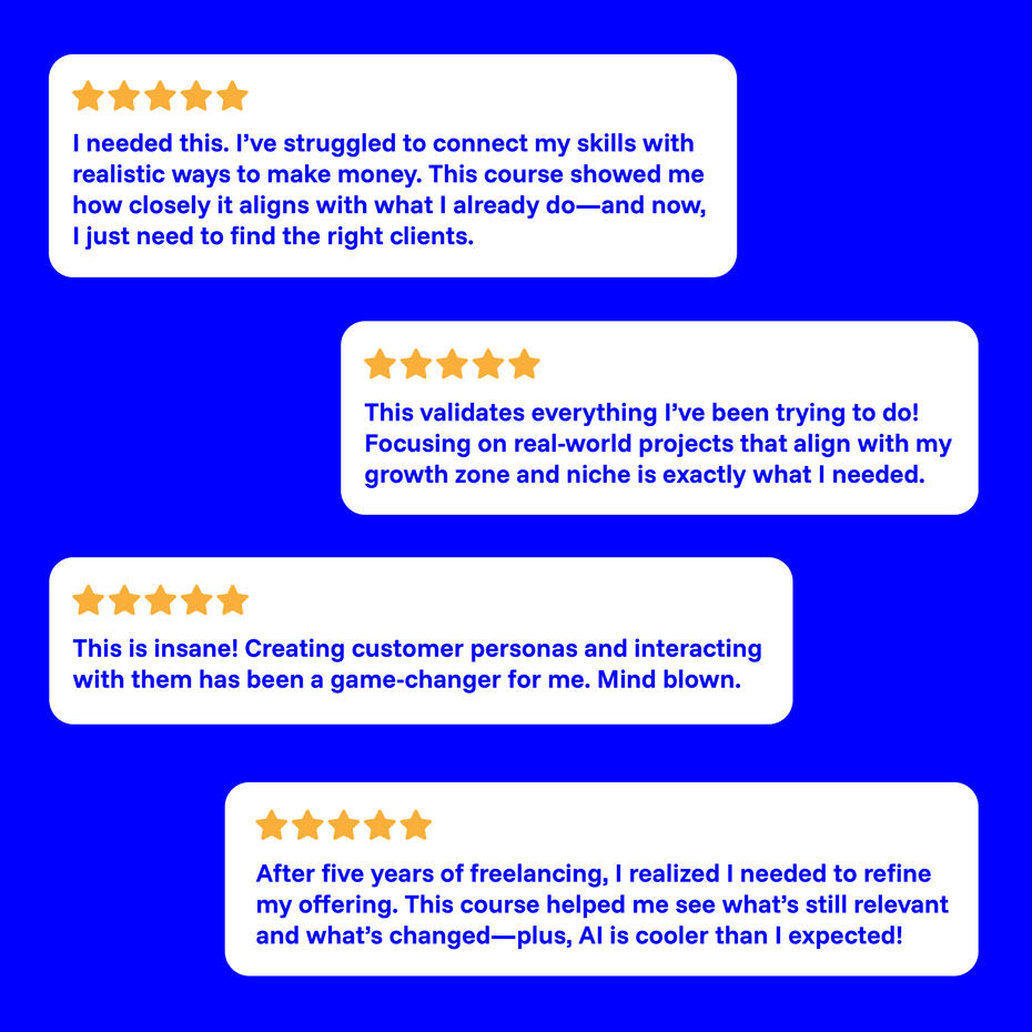 ✅ Completely online – Learn from anywhere, on your own schedule. No commute, no hassle.✅ No group calls – No awkward Zoom meetings or adjusting your schedule. Just actionable learning, at your own pace, and in your own space.✅ Cohort-based learning – Learn alongside other freelancers, share insights, and stay accountable without feeling lost.✅ Self-paced – Move through the material at your own speed. No deadlines, no stress.